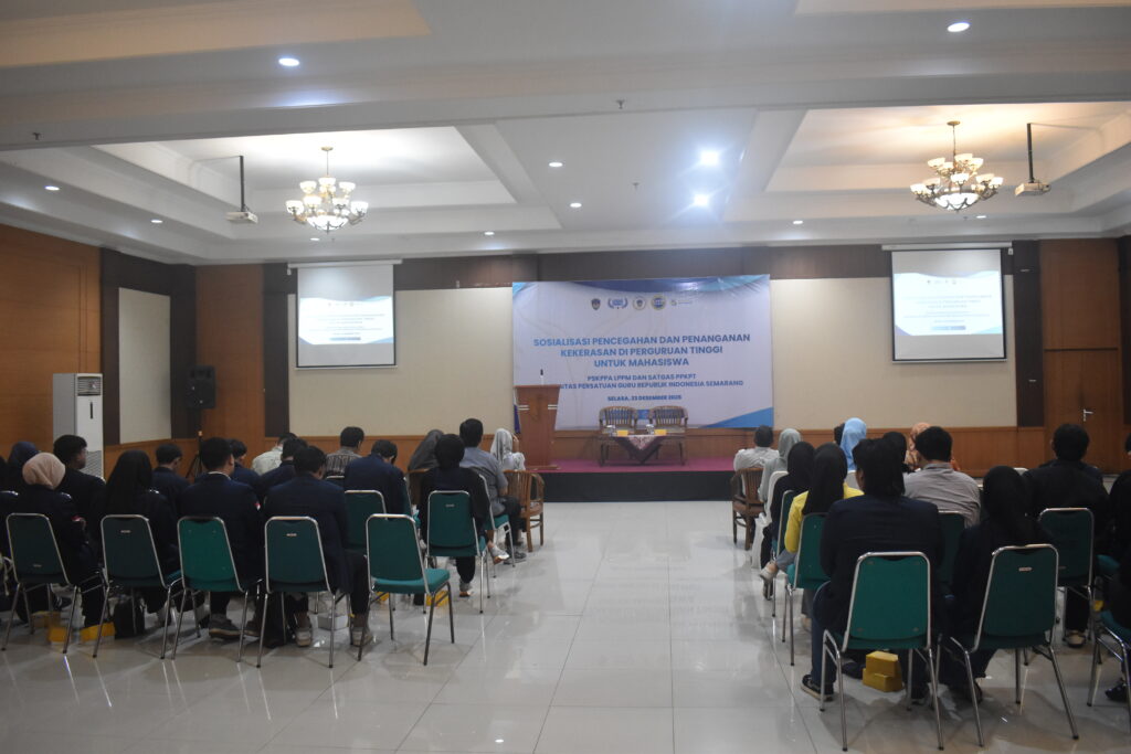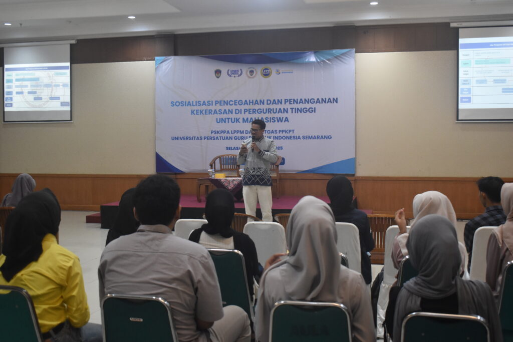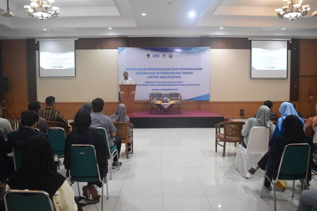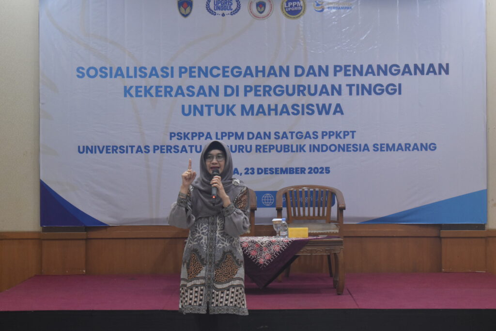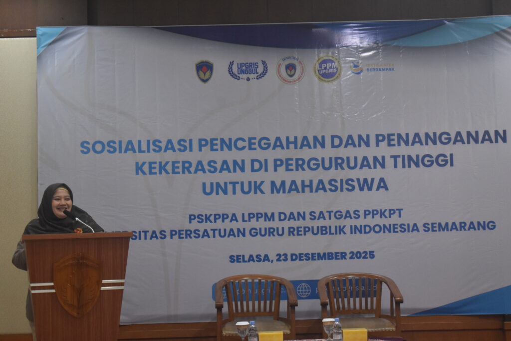 Semarang – Lembaga Penelitian dan Pengabdian kepada Masyarakat (LPPM) Universitas Persatuan Guru Republik Indonesia (UPGRIS) Semarang melalui PSKPPA LPPM bekerja sama dengan Satgas PPKPT menyelenggarakan kegiatan Sosialisasi Pencegahan dan Penanganan Kekerasan di Perguruan Tinggi untuk Mahasiswa pada Selasa, 23 Desember 2025.