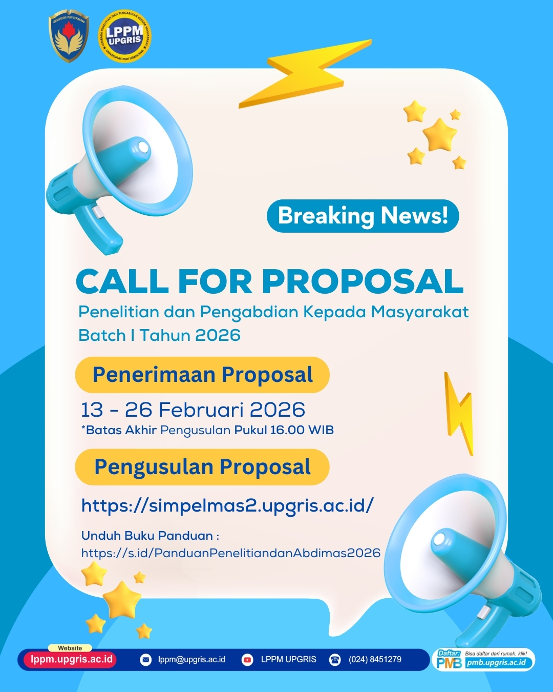 LPPM Universitas PGRI Semarang menyampaikan informasi kepada seluruh dosen bahwa telah dibuka pengajuan proposal Penelitian dan Pengabdian kepada Masyarakat pendanaan Universitas PGRI Semarang Tahun 2026.
